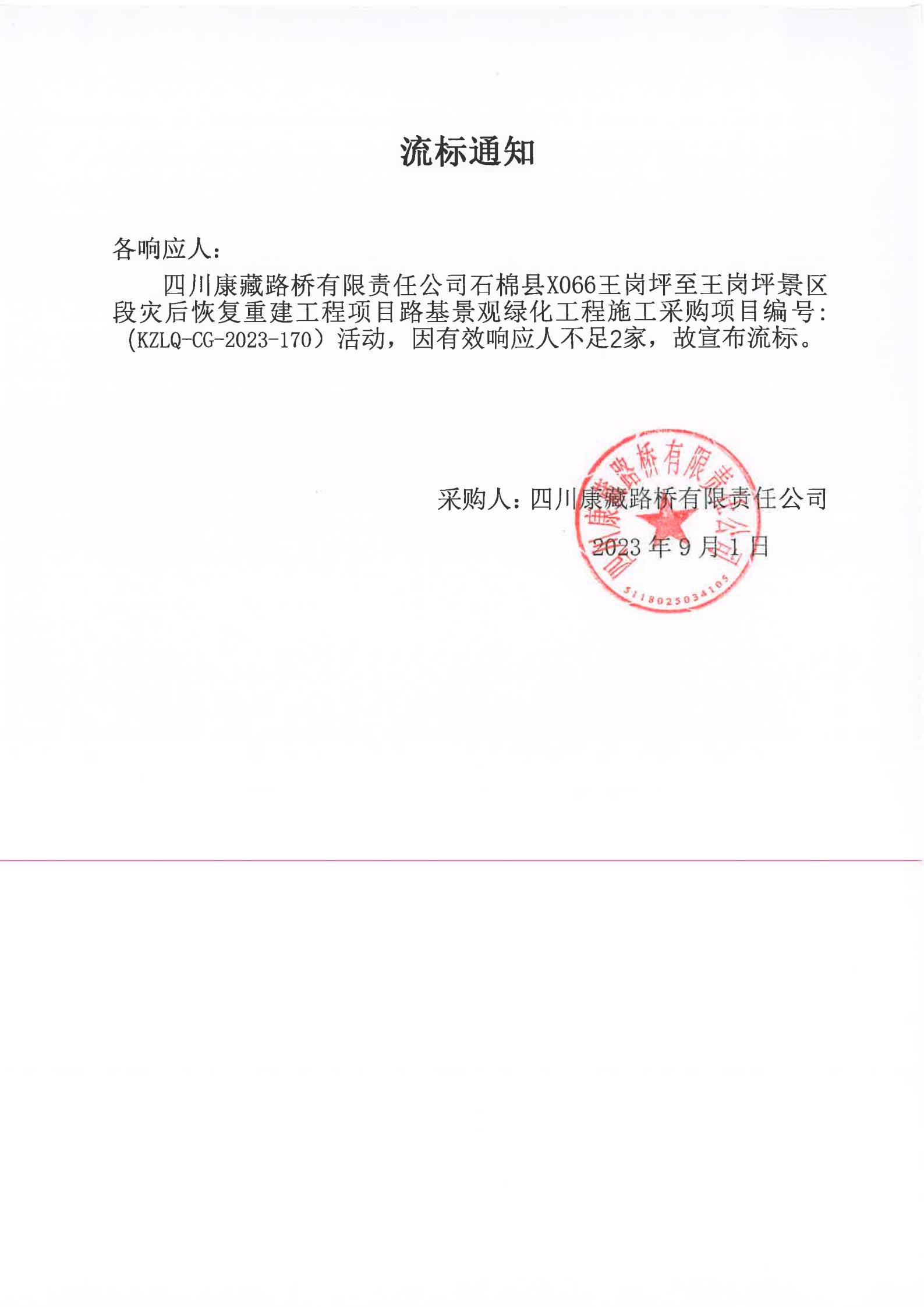 四川康藏路橋有限責(zé)任公司石棉縣X066王崗坪至王崗坪景區(qū)段災(zāi)后恢復(fù)重建工程項(xiàng)目路基景觀綠化工程施工采購(gòu)流標(biāo)通知