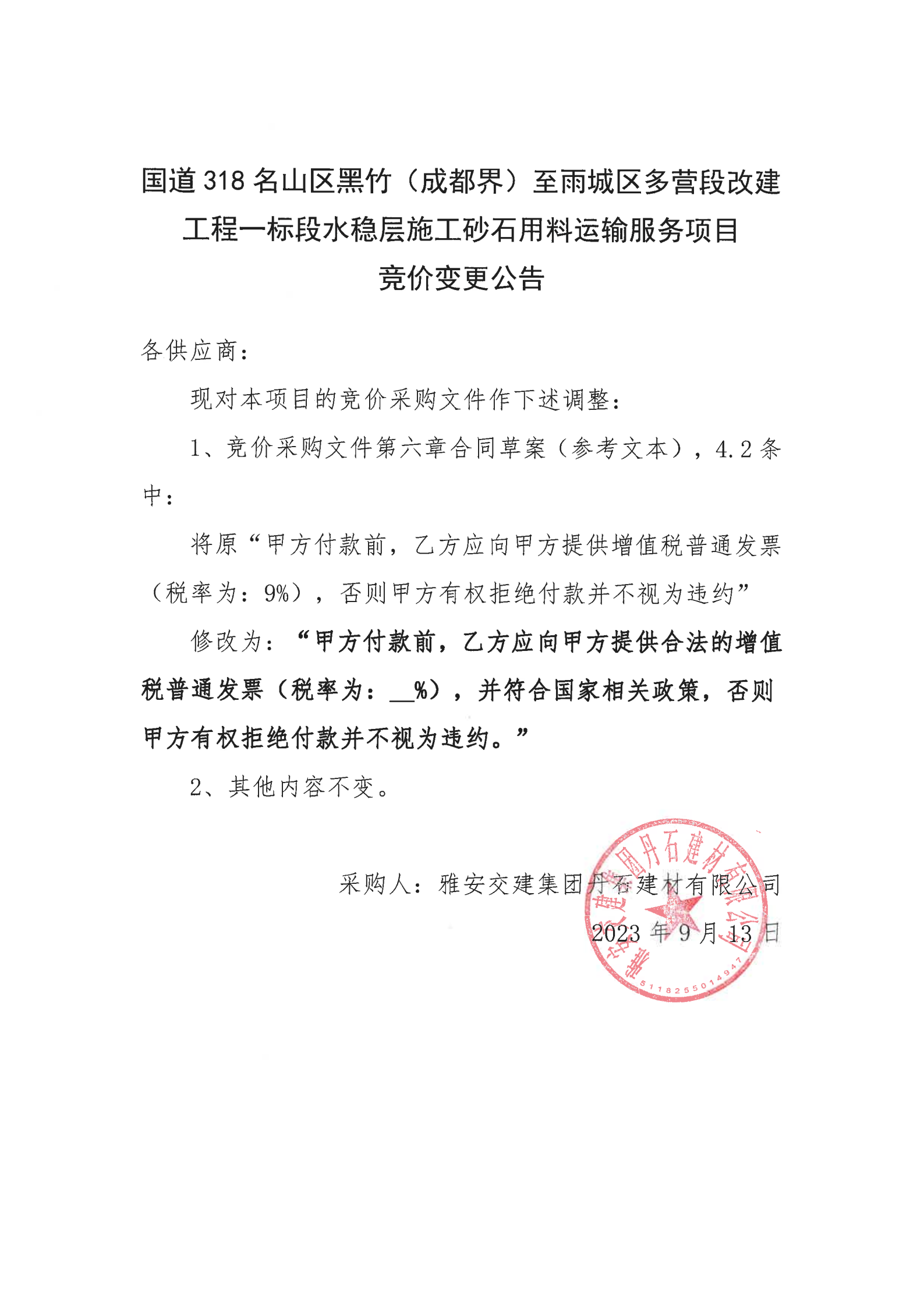 雅安交建集團(tuán)丹石建材有限公司國道318名山區(qū)黑竹(成都界)至雨城區(qū)多營段改建工程一標(biāo)段水穩(wěn)層施工砂石用料運輸服務(wù)項目競價變更公告