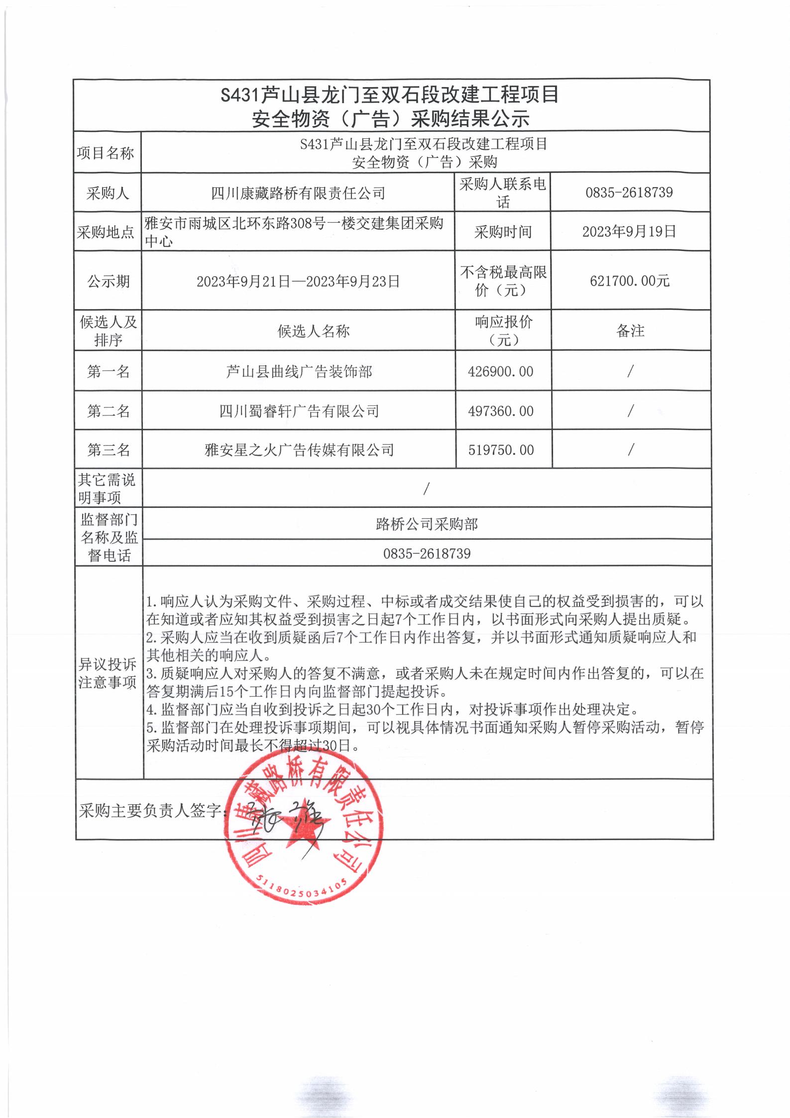 四川康藏路橋有限責(zé)任公司S431蘆山縣龍門至雙石段改建工程項(xiàng)目安全物資(廣告)采購(gòu)結(jié)果公示