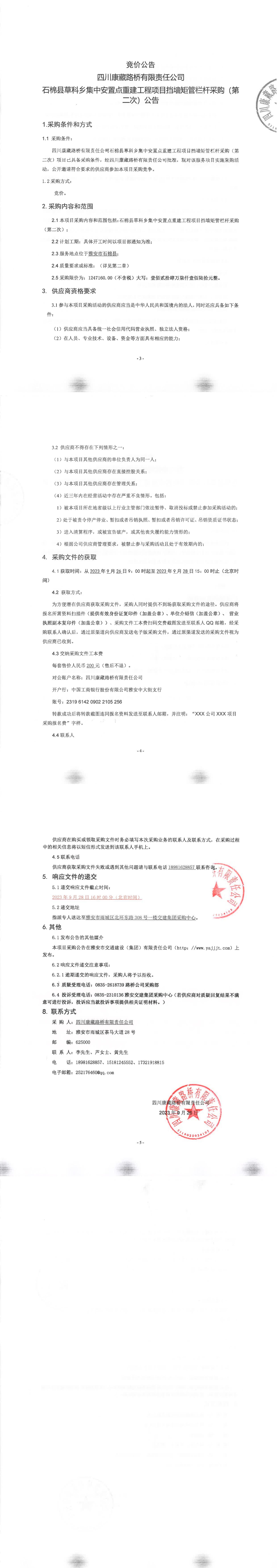 四川康藏路橋有限責(zé)任公司石棉縣草科鄉(xiāng)集中安置點重建工程項目擋墻矩管欄桿采購(第二次)公告