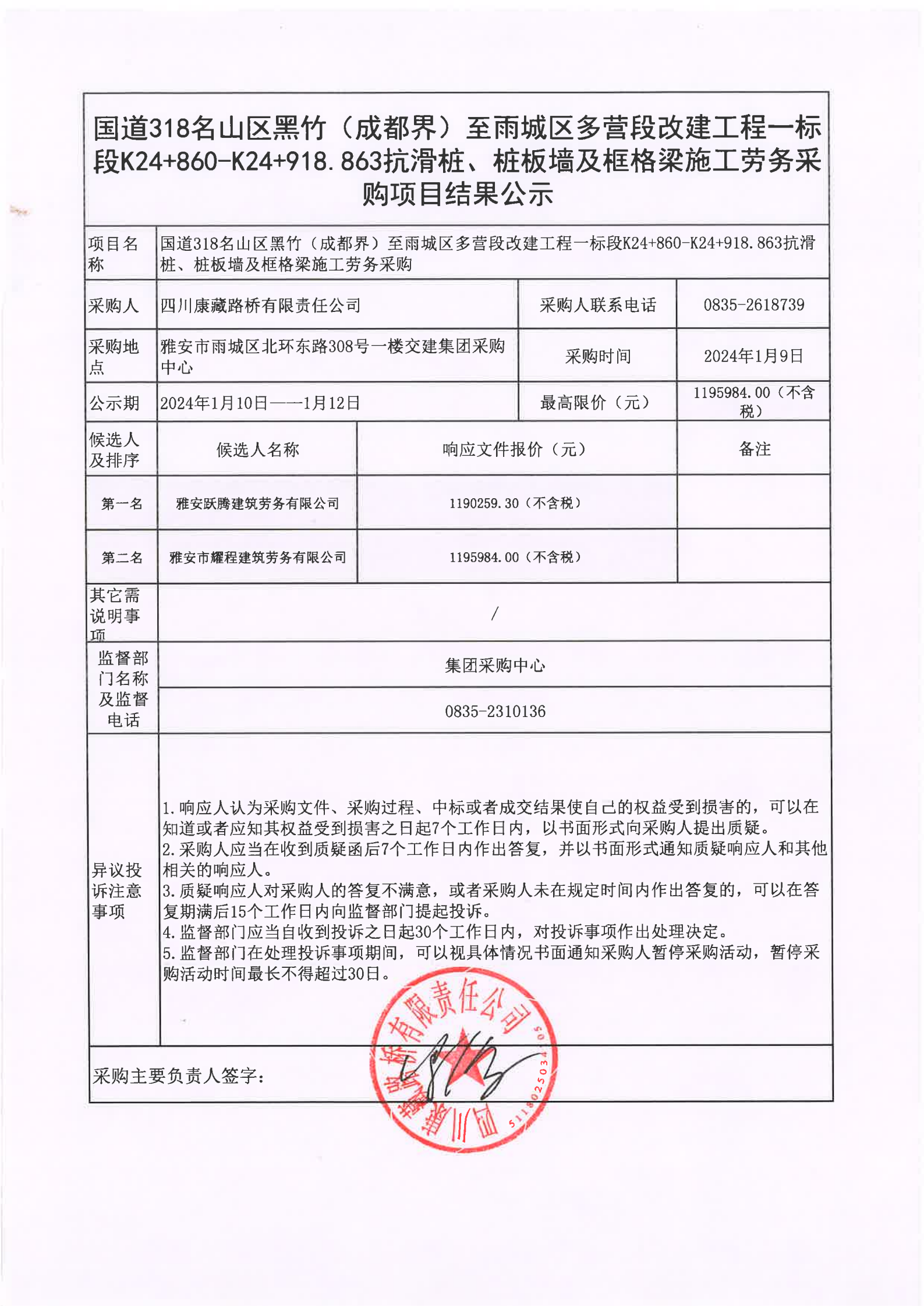 四川康藏路橋有限責(zé)任公司國道318名山區(qū)黑竹(成都界)至雨城區(qū)多營段改建工程一標(biāo)段K24+860-K24+918.863抗滑樁、樁板墻及框格梁施工勞務(wù)采購項目結(jié)果公示