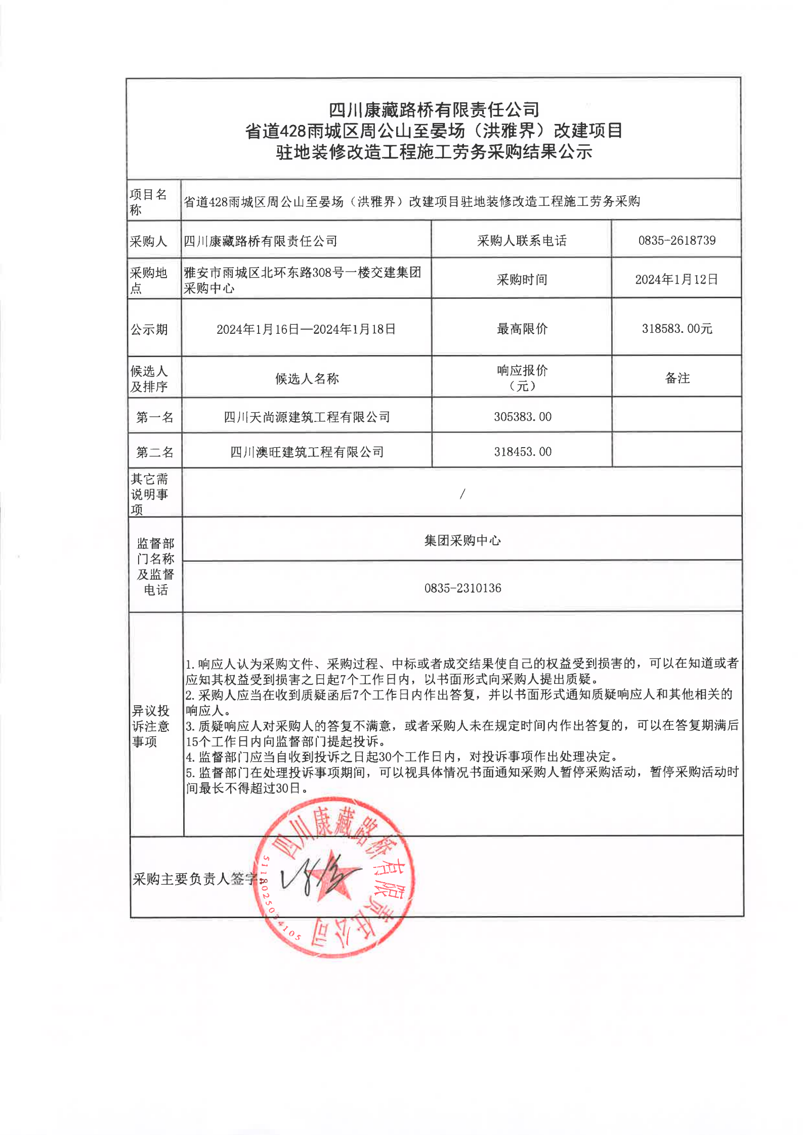 四川康藏路橋有限責(zé)任公司省道428雨城區(qū)周公山至晏場(洪雅界)改建項(xiàng)目駐地裝修改造工程施工勞務(wù)采購結(jié)果公示