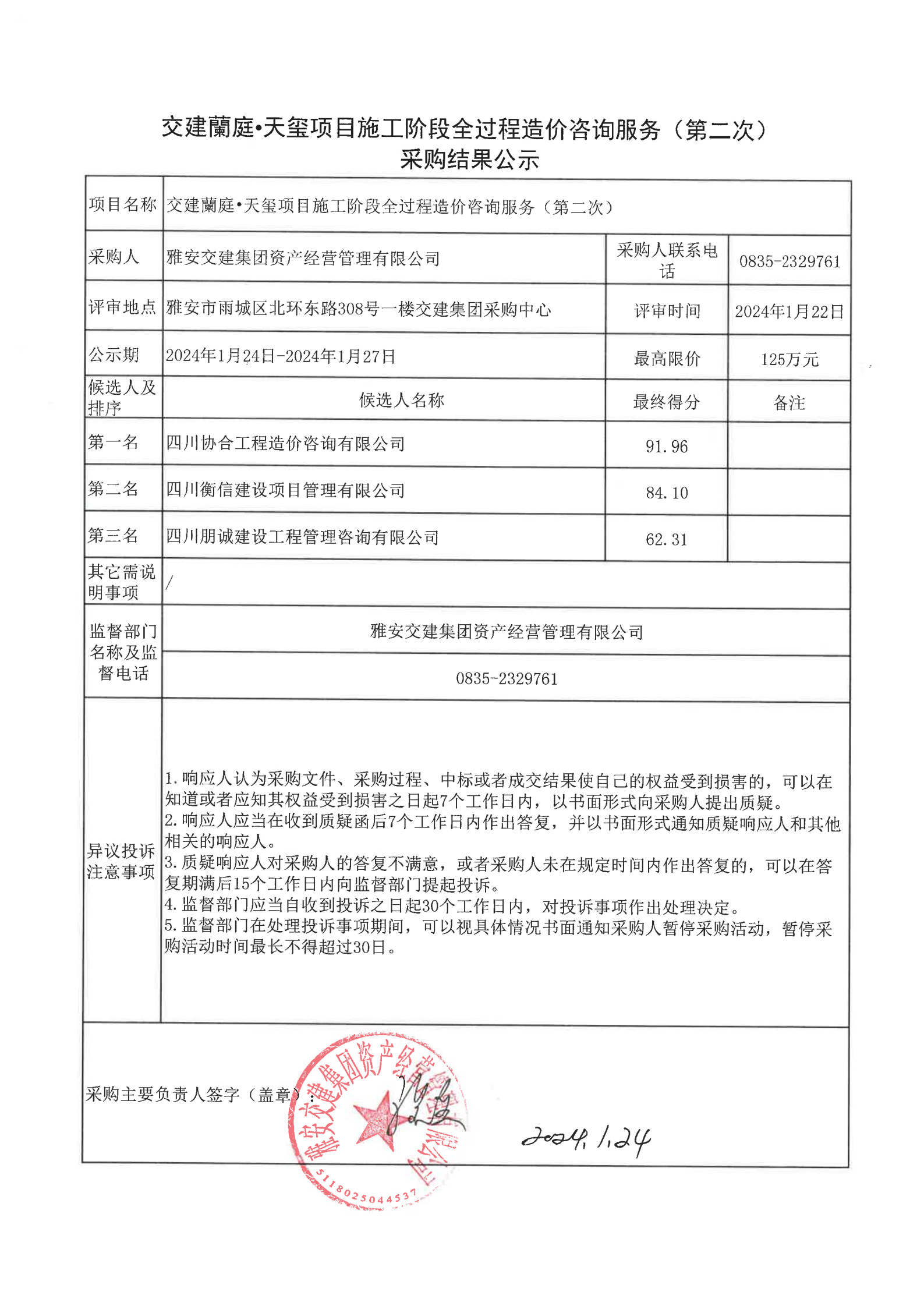 雅安交建集團資產經營管理有限公司交建蘭庭·天璽項目施工階段全過程造價咨詢服務(第二次)采購結果公示