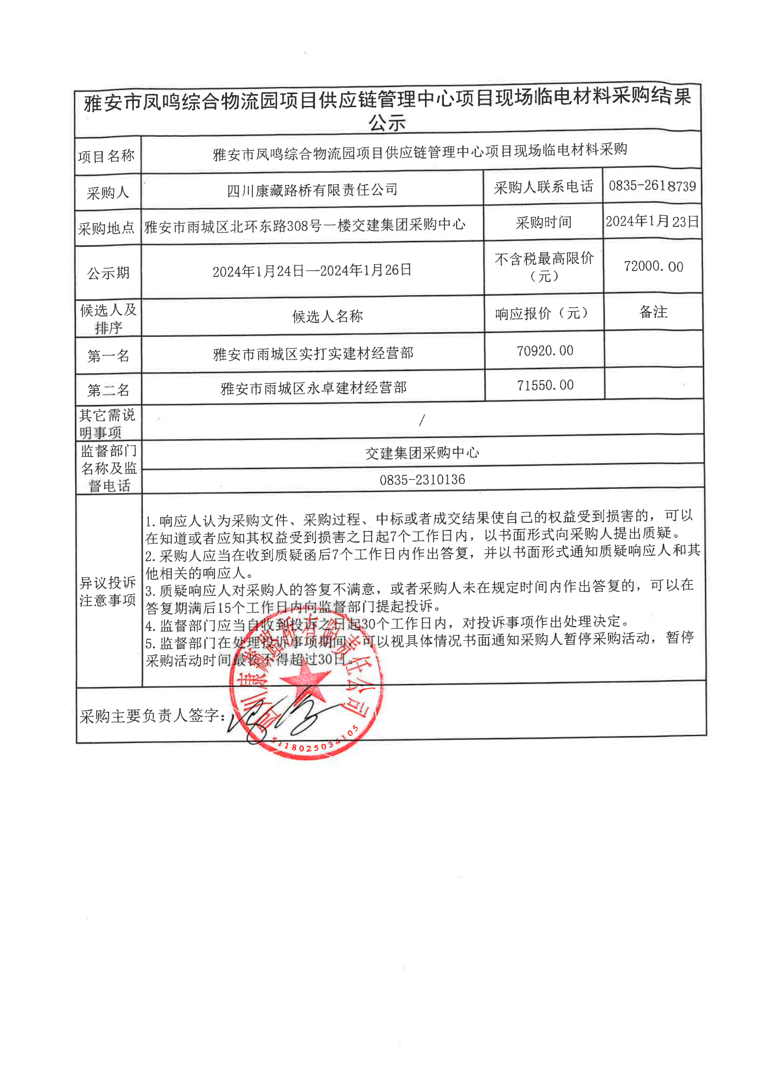四川康藏路橋有限責(zé)任公司雅安市鳳鳴綜合物流園項(xiàng)目供應(yīng)鏈管理中心項(xiàng)目現(xiàn)場臨電材料采購結(jié)果公示