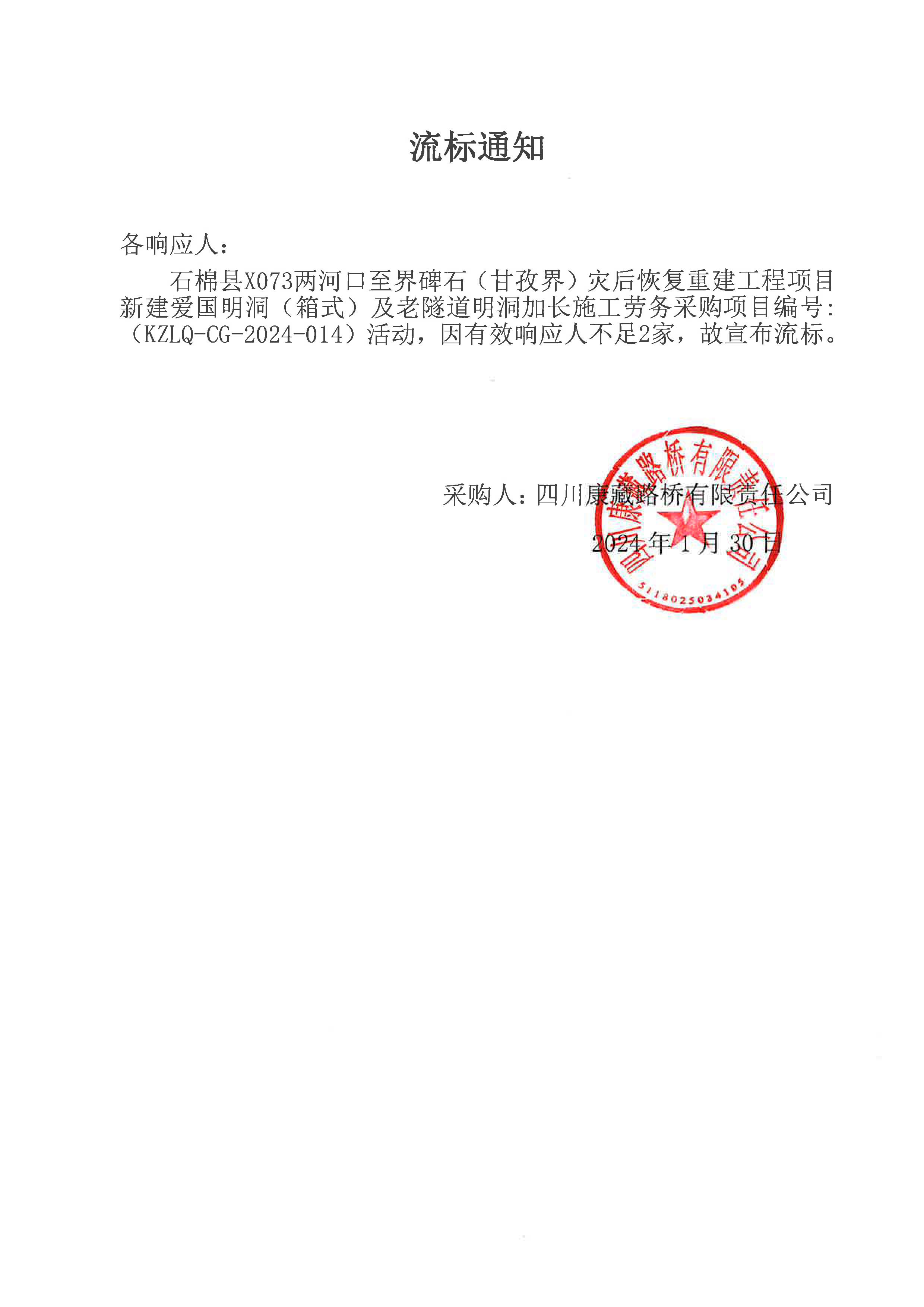 四川康藏路橋有限責(zé)任公司石棉縣X073兩河口至界碑石 (甘孜界)災(zāi)后恢復(fù)重建工程項(xiàng)目新建愛國(guó)明洞(箱式)及老隧道明洞加長(zhǎng)施工勞務(wù)流標(biāo)通知