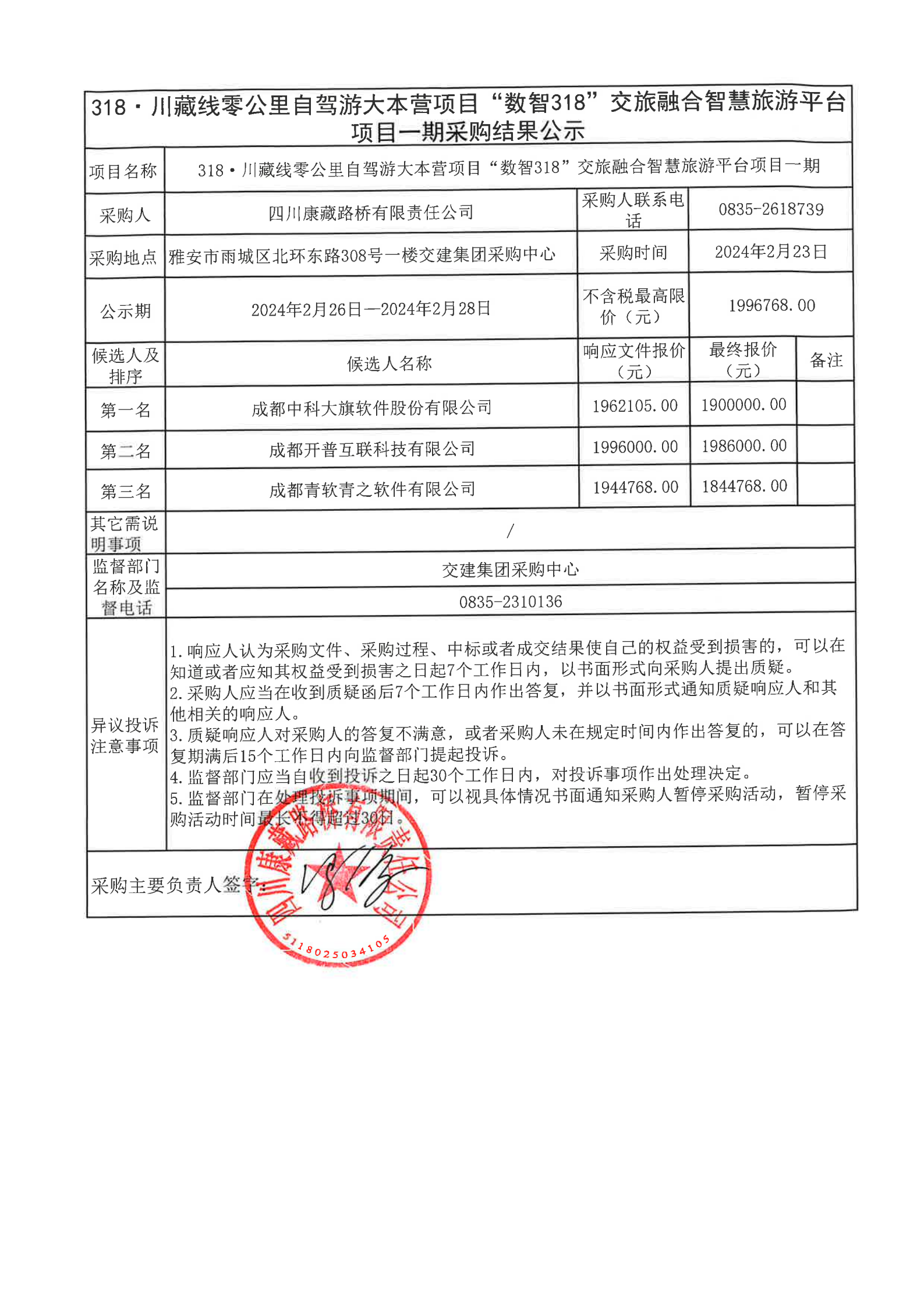 四川康藏路橋有限責(zé)任公司318·川藏公路零公里自駕游大本營項(xiàng)目“數(shù)智318”交旅融合智慧旅游平臺項(xiàng)目一期采購結(jié)果公示