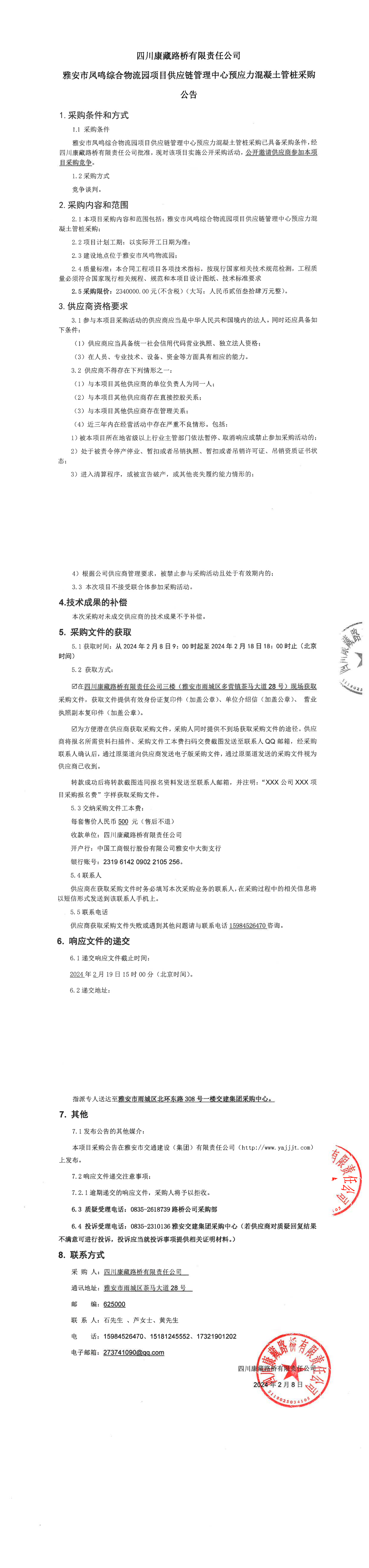 四川康藏路橋有限責任公司雅安市鳳鳴綜合物流園項目供應鏈管理中心預應力混凝土管樁采購公告