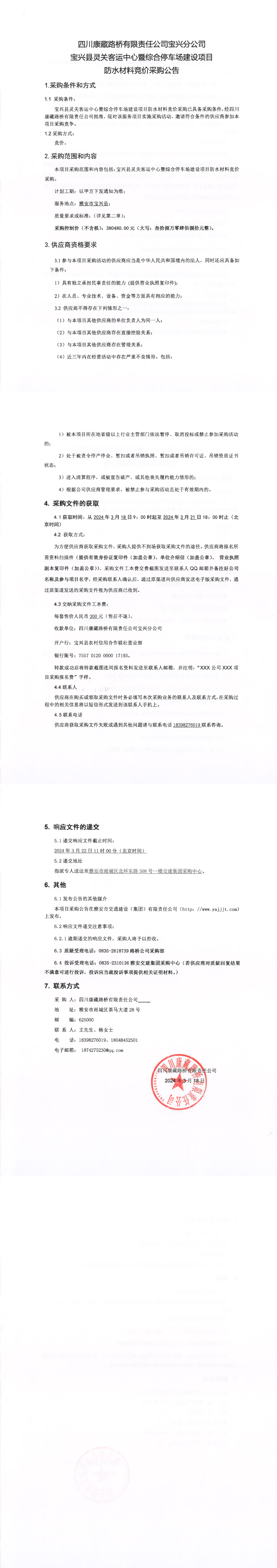 四川康藏路橋有限責任公司寶興縣靈關客運中心暨綜合停車場建設項目防水材料競價采購公告