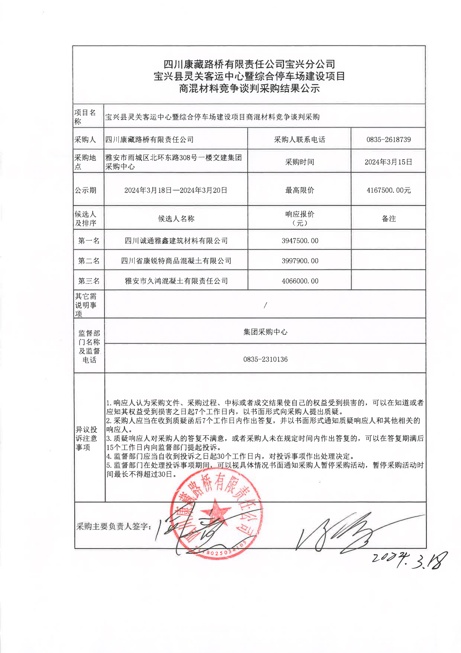 四川康藏路橋有限責(zé)任公司寶興分公司寶興縣靈關(guān)客運(yùn)中心暨綜合停車場(chǎng)建設(shè)項(xiàng)目商混材料競(jìng)爭(zhēng)談判采購(gòu)結(jié)果公示