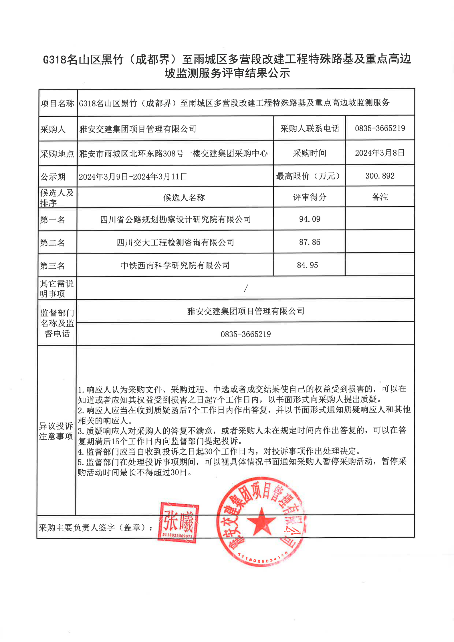 雅安交建集團項目管理有限公司G318名山區(qū)黑竹(成度界)至雨城區(qū)多營段改建工程特殊路基及重點高邊坡監(jiān)測服務(wù)評審結(jié)果公示