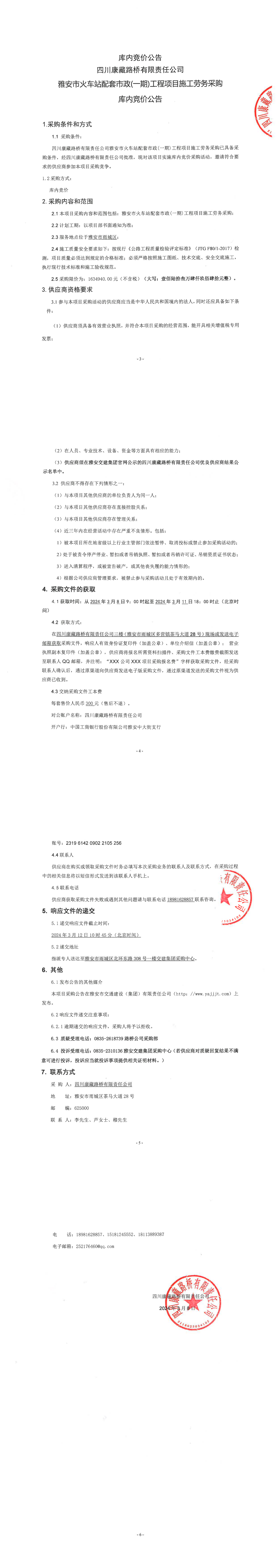 四川康藏路橋有限責(zé)任公司雅安市火車站配套市政(一期)工程項目施工勞務(wù)采購庫內(nèi)競價公告