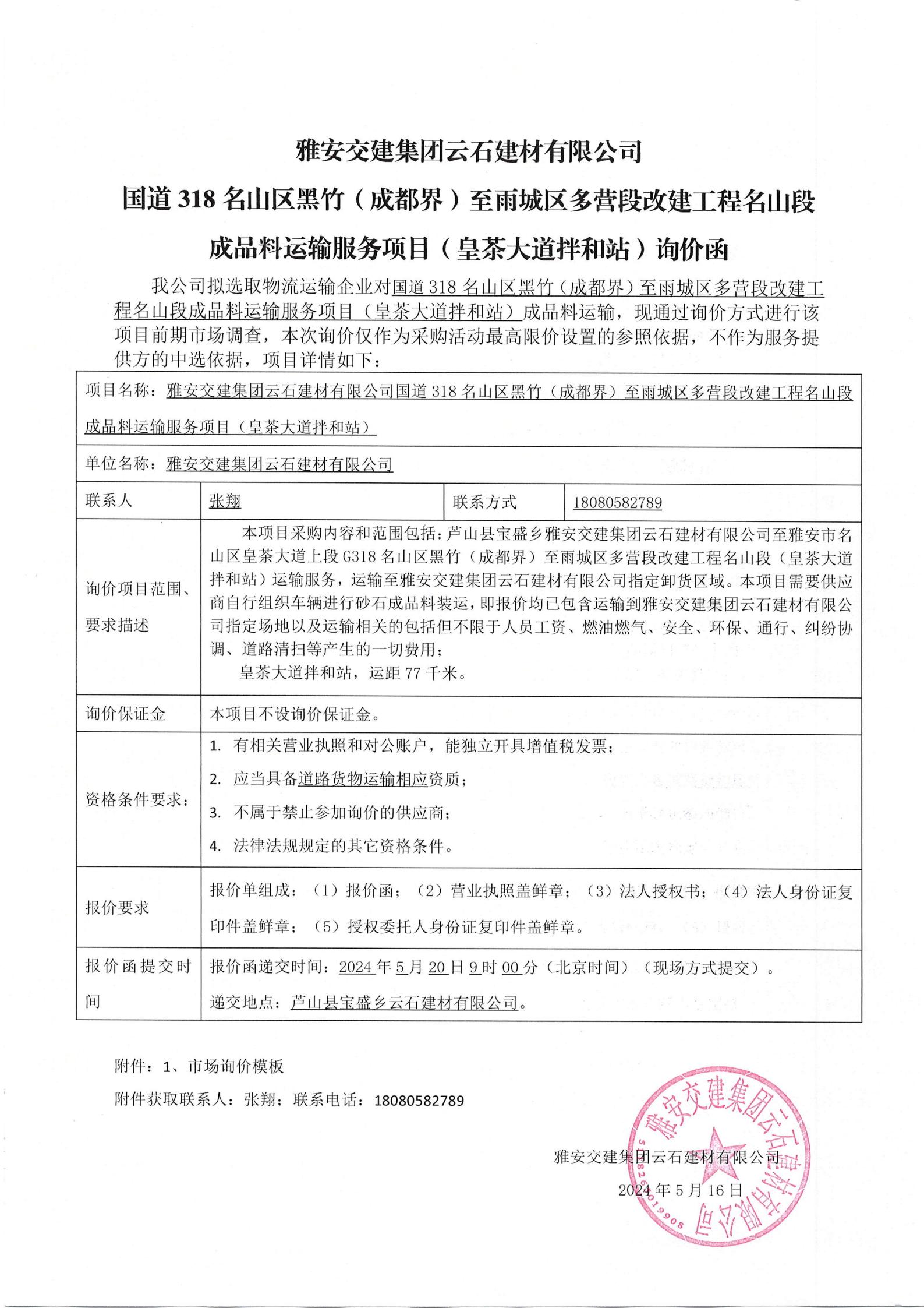 雅安交建集團(tuán)云石建材有限公司國(guó)道318名山區(qū)黑竹(成都界)至雨城區(qū)多營(yíng)段改建工程名山段成品料運(yùn)輸服務(wù)項(xiàng)目(皇茶大道拌和站)詢(xún)價(jià)函
