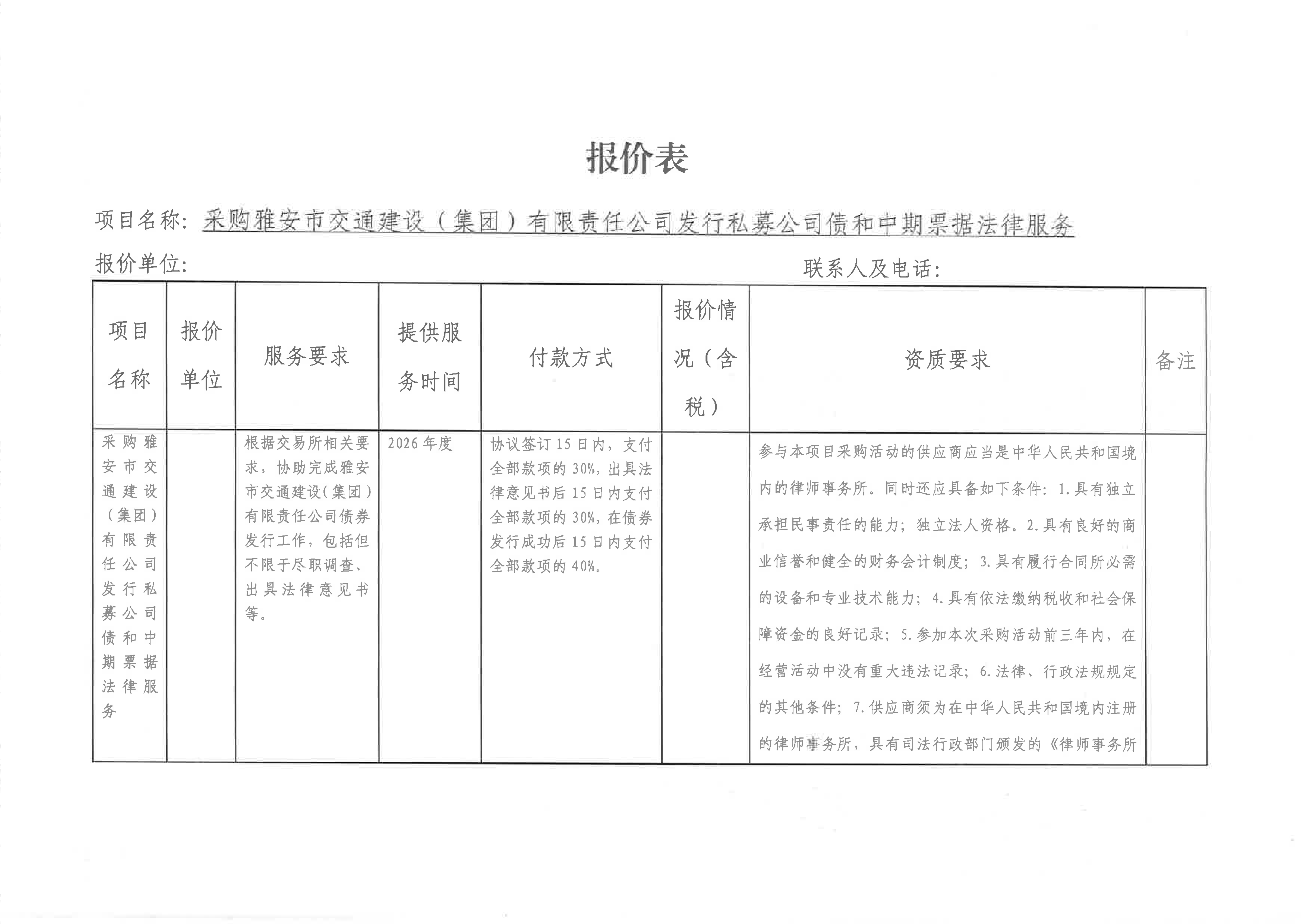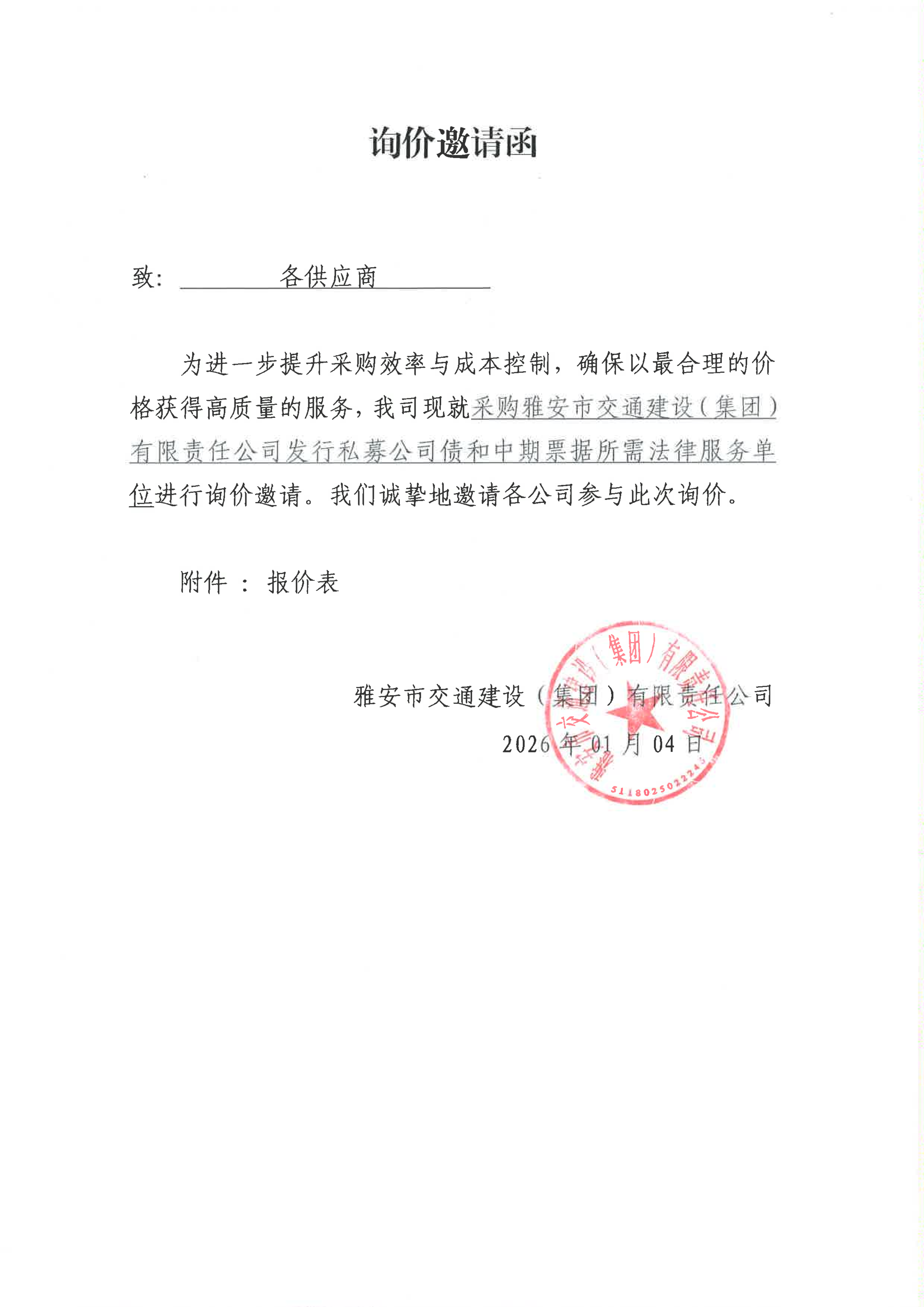 關(guān)于雅安市交通建設(shè)(集團)有限責任公司發(fā)行私募公司債和中期票據(jù)所需法律服務(wù)采購限價的詢價函