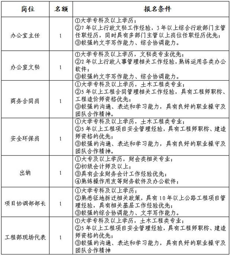 雅安交建集團資產(chǎn)經(jīng)營管理有限公司是雅安市重點國有企業(yè)雅安市交建集團下屬子公司,主要從事企業(yè)資產(chǎn)經(jīng)營管理;項目投資;土地整理等業(yè)務(wù)。根據(jù)公司發(fā)展需要,決定面向社會公開招聘7名工作人員,現(xiàn)將有關(guān)事項公告如下: