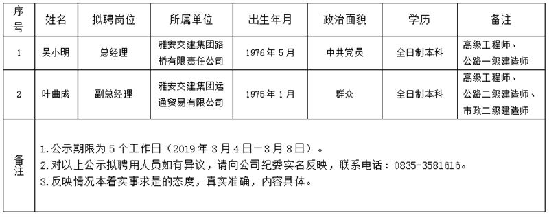 雅安交建集團(tuán)子公司擬聘用人員公示(路橋、運(yùn)通)