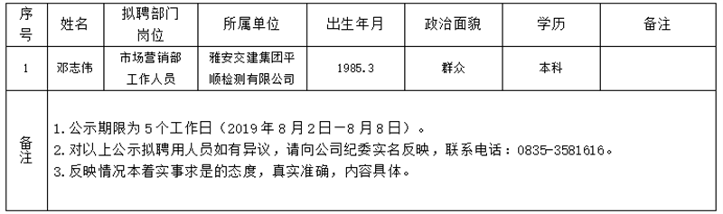 雅安交建集團(tuán)子公司擬聘用人員公示(平順公司)