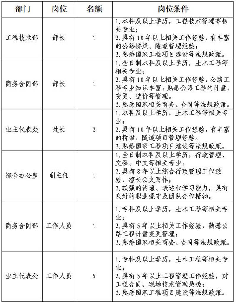 根據(jù)發(fā)展需要,決定面向社會(huì)公開招聘雅安市交通建設(shè)(集團(tuán))有限責(zé)任公司(以下簡稱“雅安交建集團(tuán)”)所屬子公司管理人員及工作人員共計(jì)11名,現(xiàn)將有關(guān)事項(xiàng)公告如下: