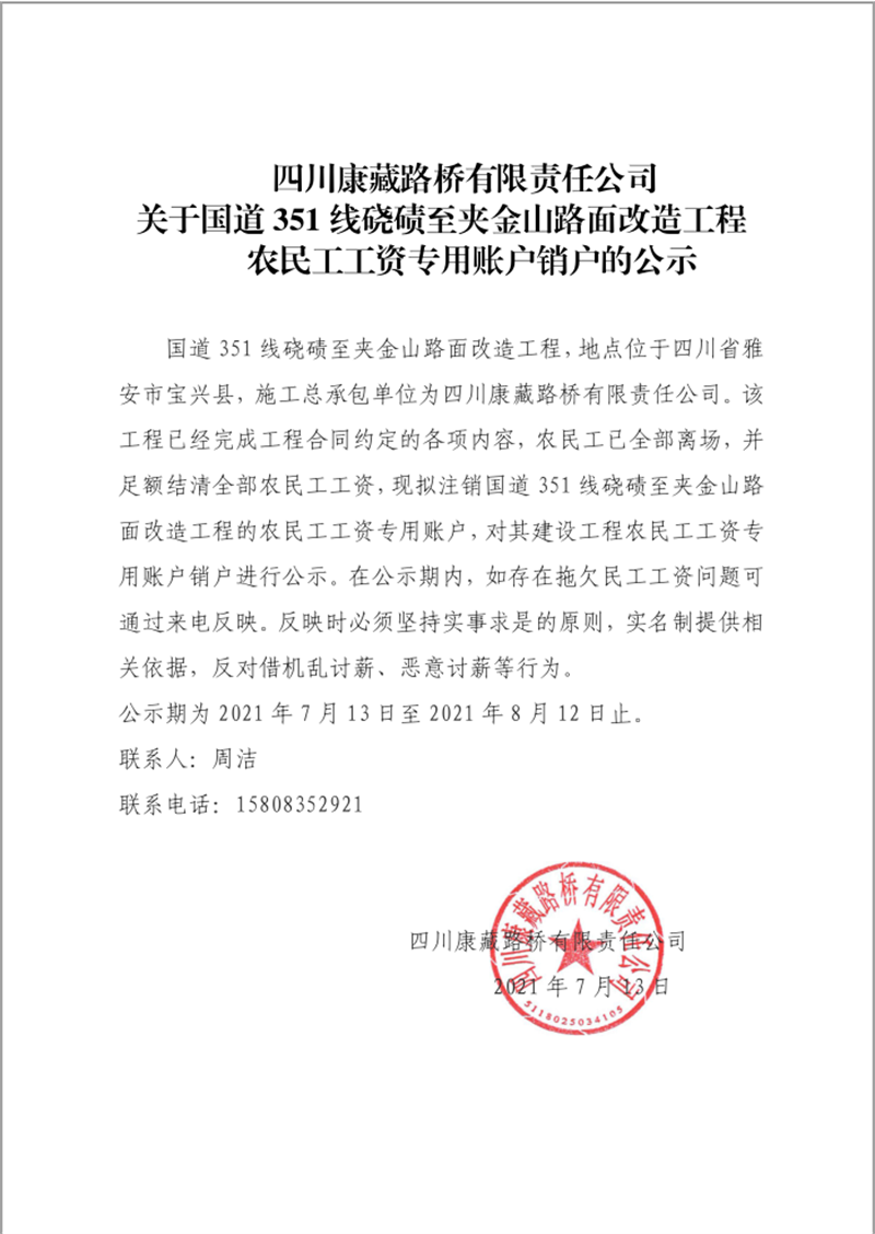 關(guān)于國(guó)道351線磽磧至夾金山路面改造工程農(nóng)民工工資專用賬戶銷戶的公示