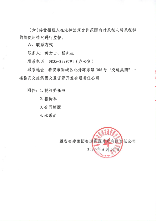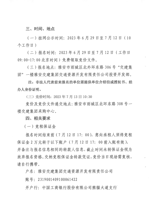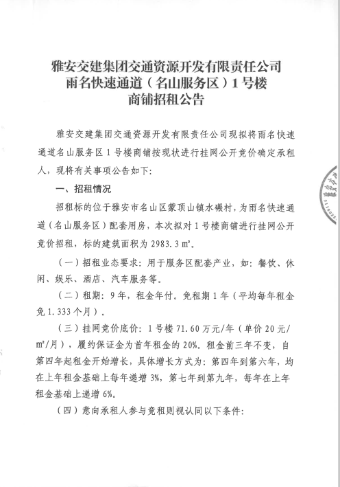 雅安交建集團交通資源開發(fā)有限責任公司雨名快速通道名山服務區(qū)1號樓招租公告附件