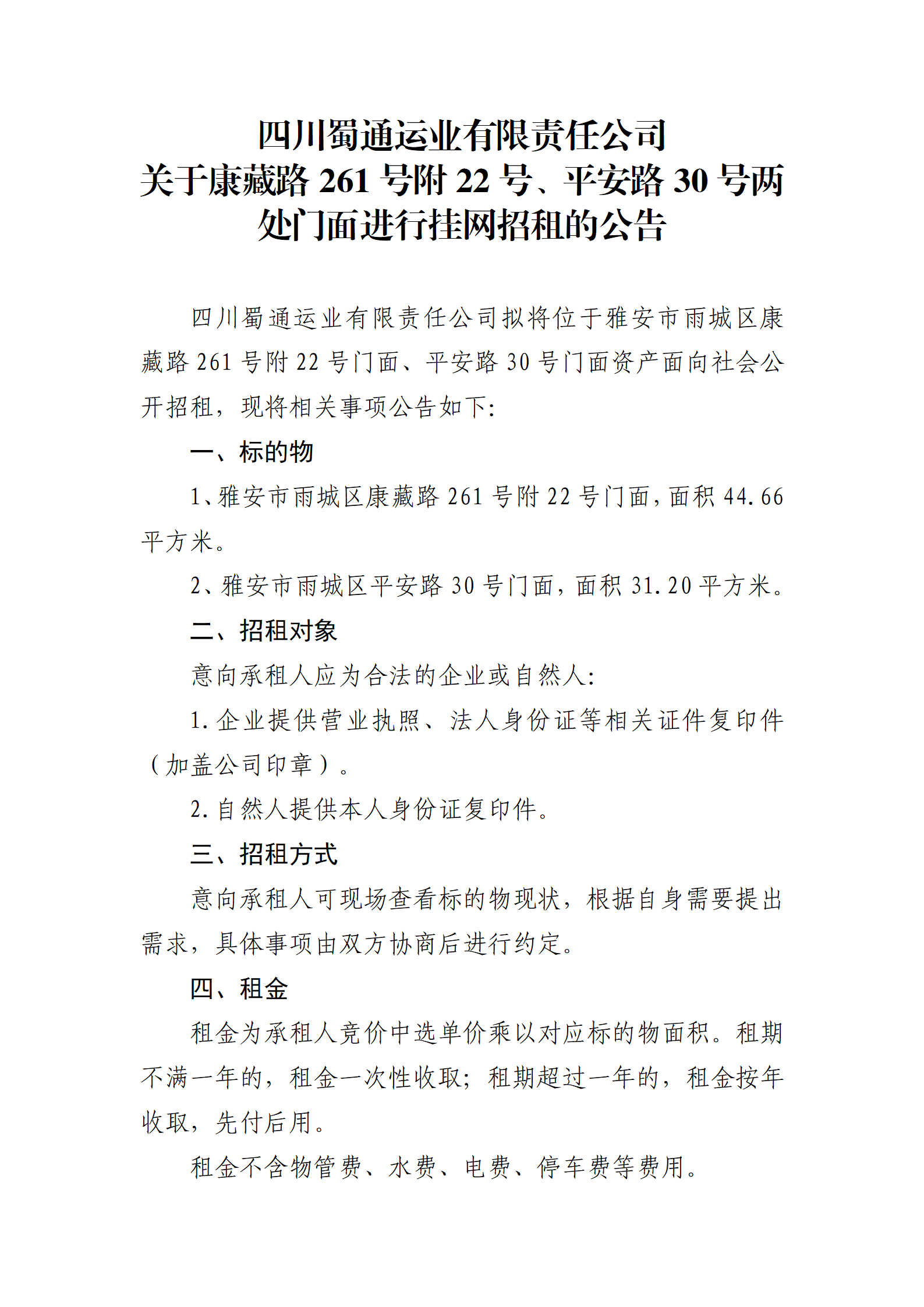 四川蜀通運(yùn)業(yè)有限責(zé)任公司 關(guān)于康藏路261號附22號、平安路30號兩處門面進(jìn)行掛網(wǎng)招租的公告