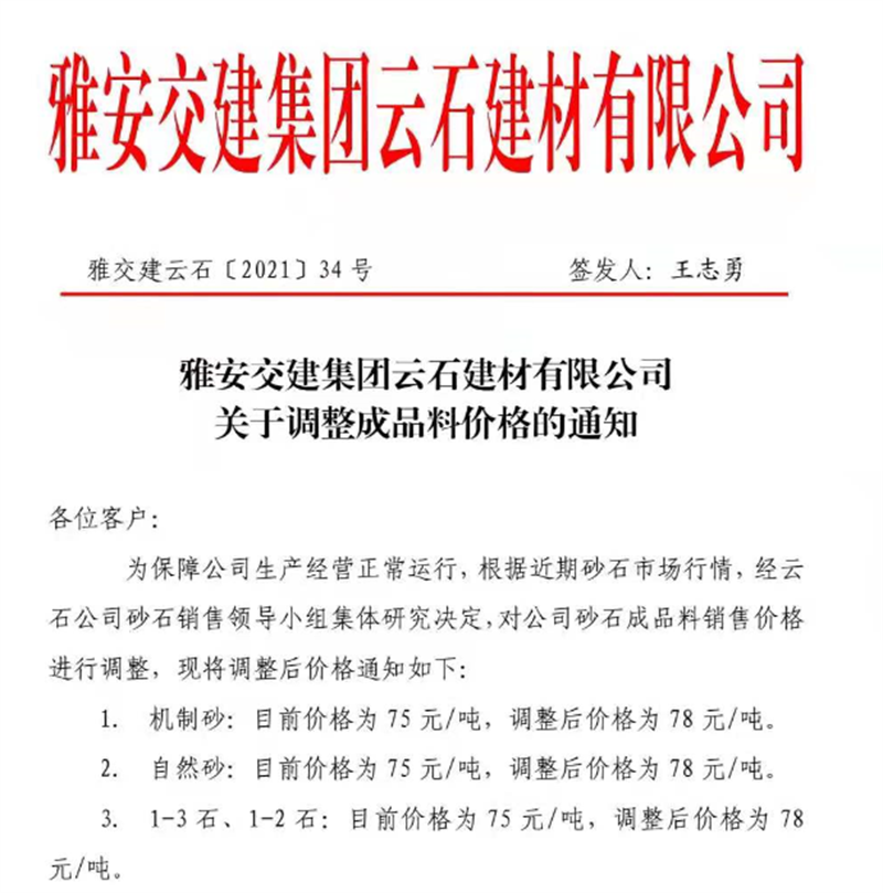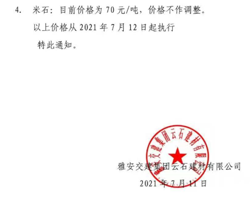 雅安交建集團(tuán)云石公司砂石骨料銷售價(jià)格情況表(2021.7.12)