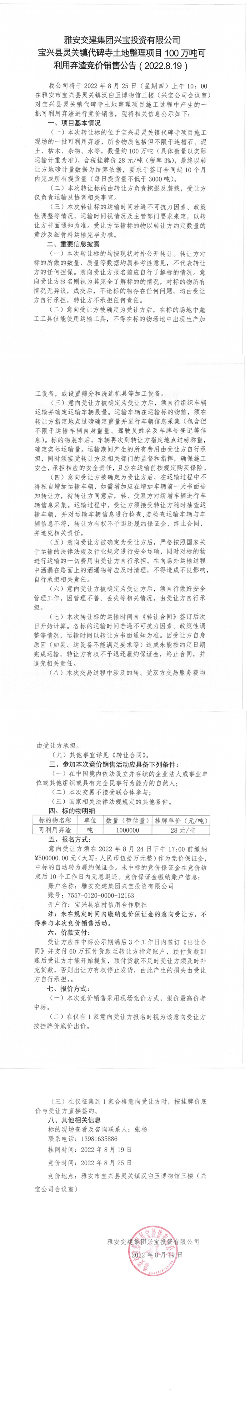 雅安交建集團興寶投資有限公司靈關鎮(zhèn)代碑寺土地整理項目10萬噸可利用棄渣競價銷售公告(2022.8.19)(1)