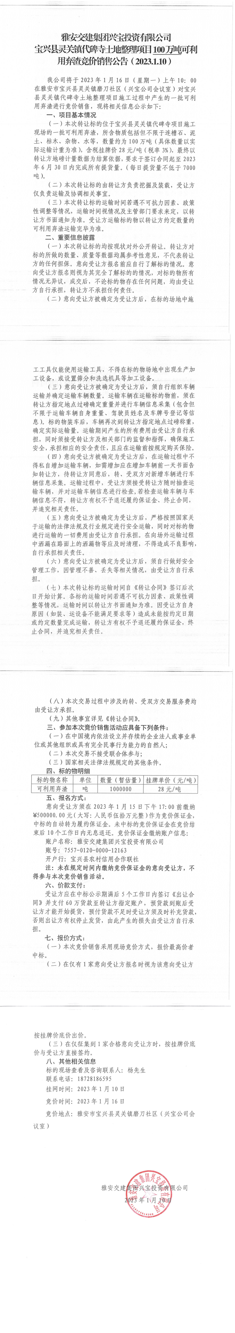 雅安交建集團興寶投資有限公司靈關鎮(zhèn)代碑寺土地整理項目100萬噸可利用棄渣競價銷售公告(2023.1.10)