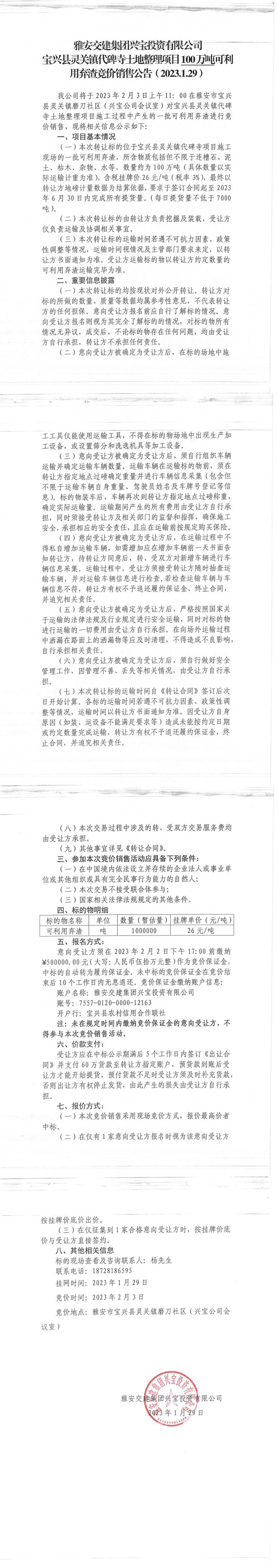 雅安交建集團興寶投資有限公司靈關(guān)鎮(zhèn)代碑寺土地整理項目100萬噸可利用棄渣競價銷售公告(2023.1.29)