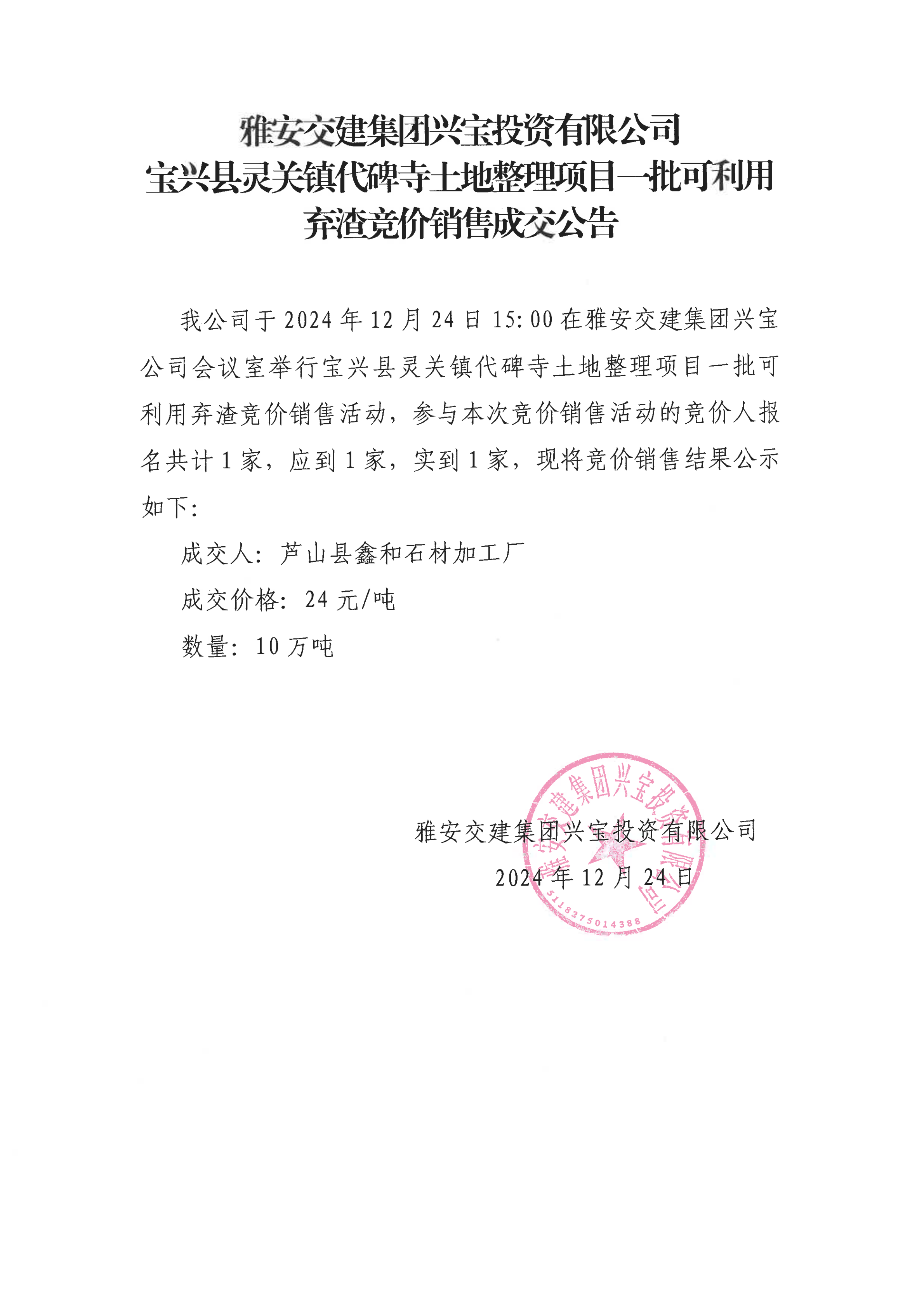 雅安交建集團(tuán)興寶投資有限公司靈關(guān)鎮(zhèn)代碑寺土地整理項(xiàng)目5萬噸可利用棄渣成交公告(2024.12.24)